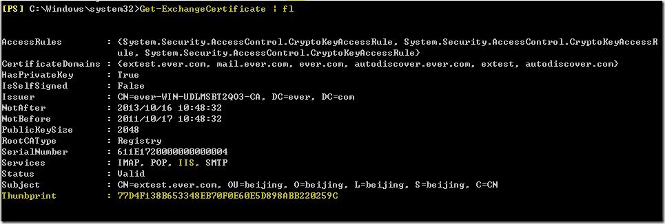 get-ExchangeCertificate | fl2.找到要使用的证书,然后记录其指纹和主题。