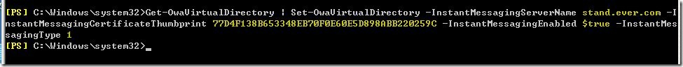 Get-OwaVirtualDirectory | Set-OwaVirtualDirectory -InstantMessagingServerName <name of Instant Messaging server or pool to connect to> -InstantMessagingCertificateThumbprint <certificate thumbprint> -InstantMessagingEnabled true -InstantMessagingType 1注意: