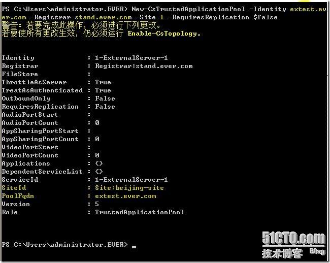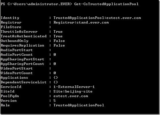 2.运行 New-CsTrustedApplicationPool cmdlet 以创建受信任的应用程序池。这还会在 Lync Server 2010 中创建外部服务条目。