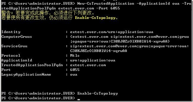 New-CsTrustedApplication -ApplicationId <ApplicationID for OWA> -TrustedApplicationPoolFqdn < OwaPoolfqdn same as what is used in SN of cert> -Port <some available port>注意: