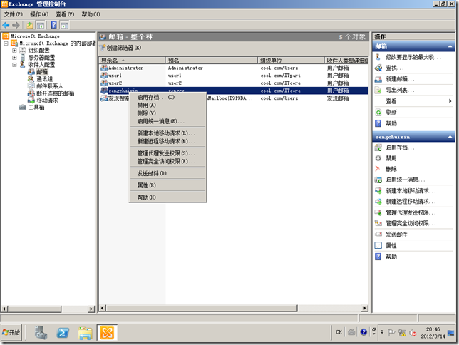 选中要设置的邮箱之后,在右侧的操作窗格中选择【管理代理发送权限】,如图所示