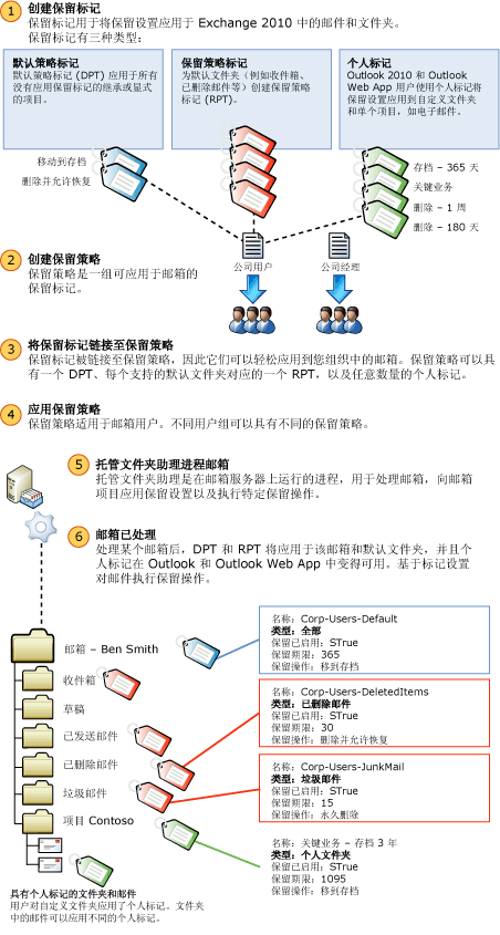 保留策略是 Exchange 2010 中的新 MRM 技术,它使用保留标记应用保留设置。可以创建保留标记,然后将其链接到保留策略。应用了保留策略的邮箱由托管文件夹助理处理,托管文件夹助理是按照日程安排运行并提供邮箱中的保留标记的邮箱助理。