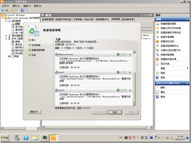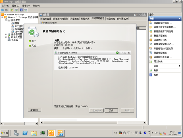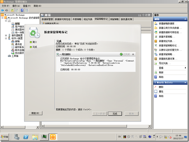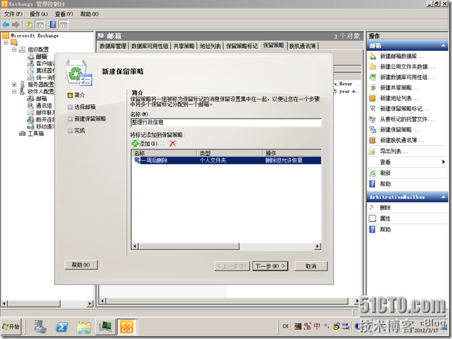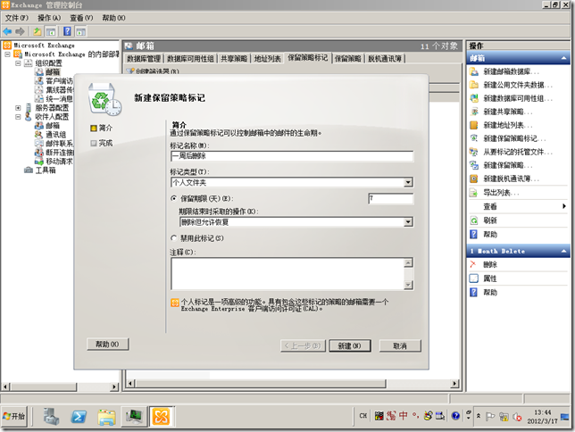 在exchange server 2010 SP1以后的版本,我们是可以通过EMC界面来充分管理保留策略功能的。