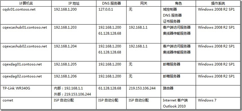 首先来说一下我的环境,我的实验环境为单域环境,域名为非常经典的contoso.net。环境中会用到4台Exchange Server 2010 SP2服务器,我们用其中的2台来部署Exchange的CAS/HUB(客户端访问/集线器传输)角色,通过Windows的负载均衡技术,来实现CAS服务器的负载平衡,另外2台用来部署Exchange的MailBox(邮箱)角色,并通过它们来组建邮箱服务器数据库高可用性组(DAG)