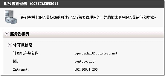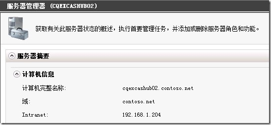 下面我们来到cqexcashub01这台服务器上,以下是cqexcashub01加入到域后的信息,它将作为第一台CAS/HUB服务器