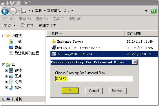 将Exchange 2010 SP2的安装包解压缩到D盘下的SP2目录中