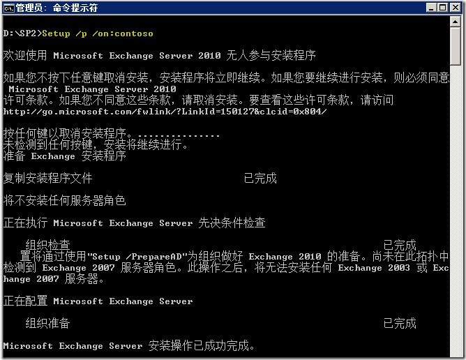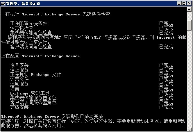 如果你不知道怎么用命令行方式进行部署,可以在Exchange安装目录下通过Setup.com /help:Install来获取到帮助,到此,我们就成功的部署了两台Exchange CAS/HUB服务器