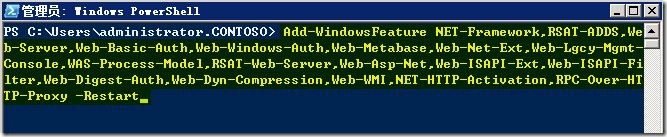 Add-WindowsFeature NET-Framework,RSAT-ADDS,Web-Server,Web-Basic-Auth,Web-Windows-Auth,Web-Metabase,Web-Net-Ext,Web-Lgcy-Mgmt-Console,WAS-Process-Model,RSAT-Web-Server,Web-Asp-Net,Web-ISAPI-Ext,Web-ISAPI-Filter,Web-Digest-Auth,Web-Dyn-Compression,Web-WMI,NET-HTTP-Activation,RPC-Over-HTTP-Proxy -Restart