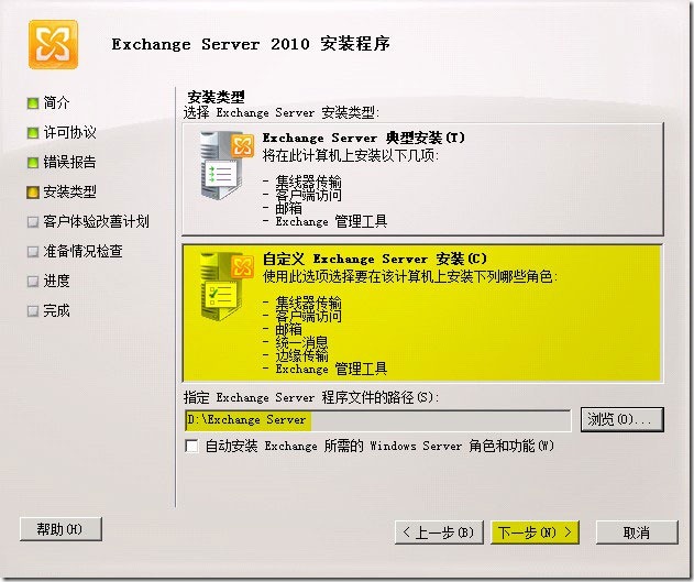 这步我们要选择【自定义Exchange Server安装】,然后指定Exchange的安装目录,这里我将Exchange安装到D:\Exchange Server目录中