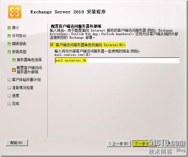 勾选【客户端访问服务器角色将面向 Internet】,指定外部客户端访问客户端访问服务器时用到的域名,这里我填入在公网上注册的域名mail.excontoso.tk(注意:这步并不是必须要设置的)