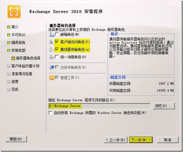 选择服务器角色,这里只勾选【客户端访问服务器】和【集线器传输服务器】