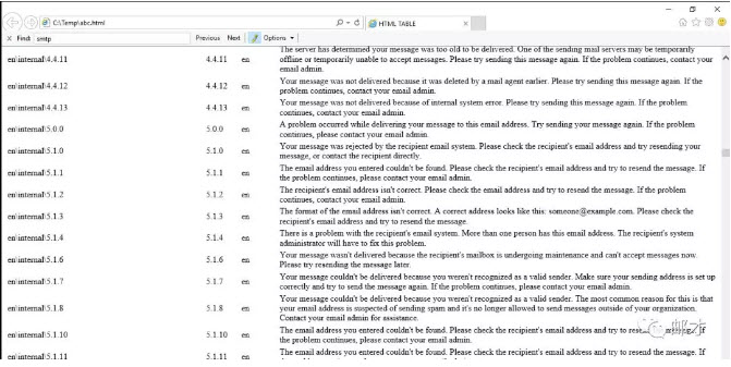Get-SystemMessage -Original | Select-Object -Property Identity,DsnCode,Language,Text | ConvertTo-Html > “C:\temp\abc.html”