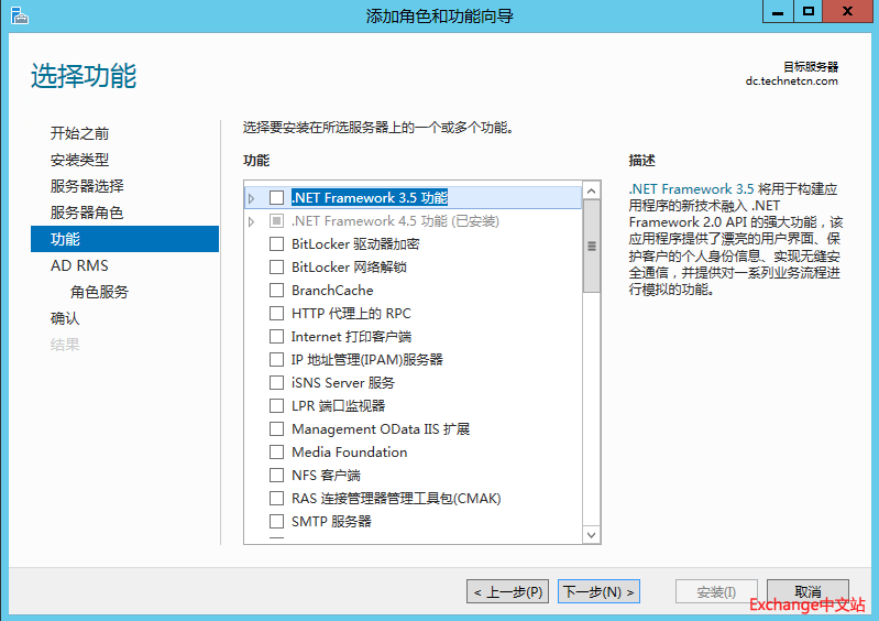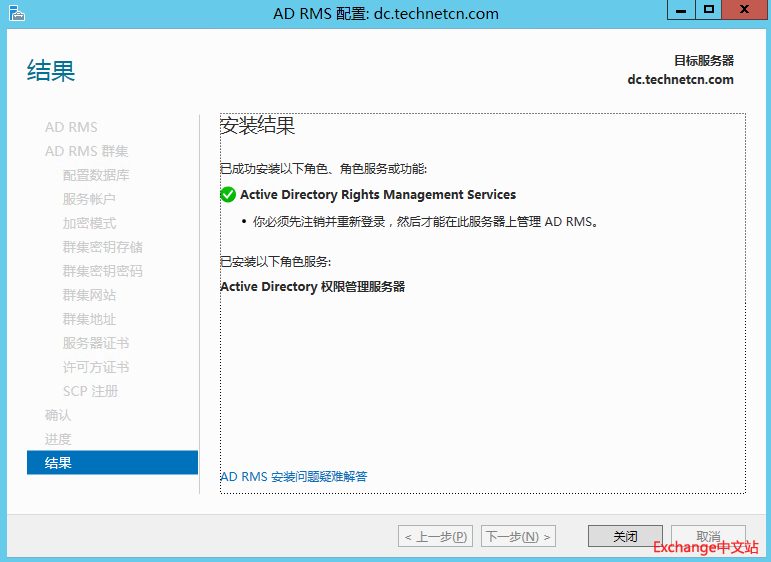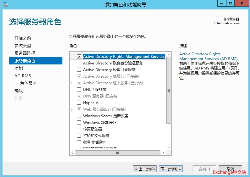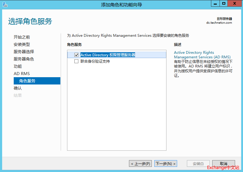 登陆到DC服务器,打开服务器管理器,添加Active Directory Rights management services角色。下一步。