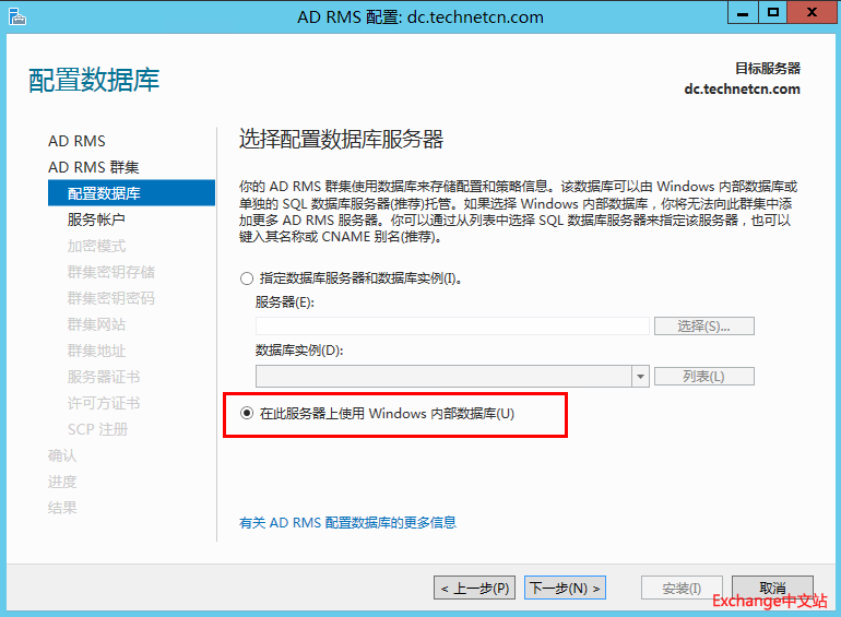 配置数据库。选择Windows 内部数据库。下一步。