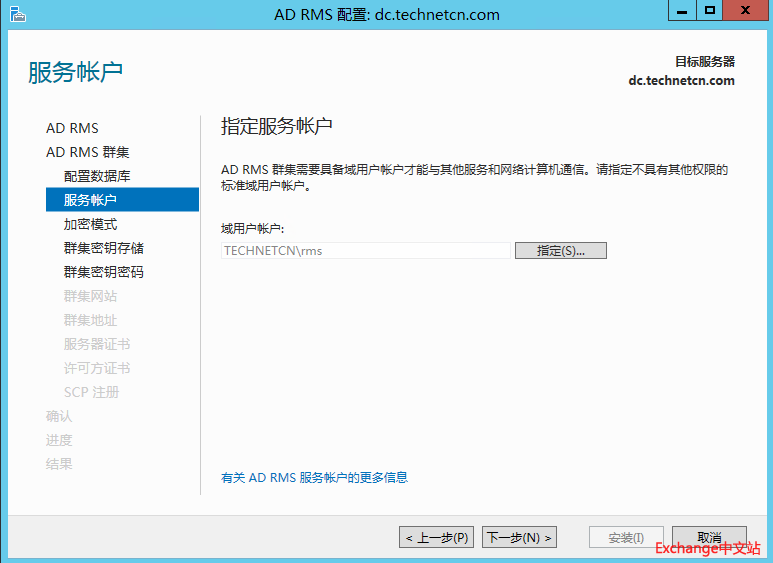IRM信息权限保护功能是通过AD RMS来实现的,所以需要先安装AD RMS服务。在安装之前需要先准备一个RMS服务账户,该账户不能是Domain Admin,为Domain User即可,需要为服务器本地Administrators成员。