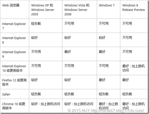 要体验所有 Outlook Web App 功能,请使用下表中指示的标记为“最好”的操作系统和浏览器组合之一。许多操作系统和 Web 浏览器组合都支持 Outlook Web App,但并非所有组合中都提供所有 Outlook Web App 功能。