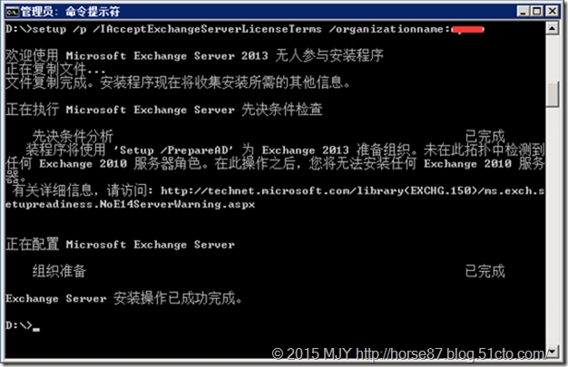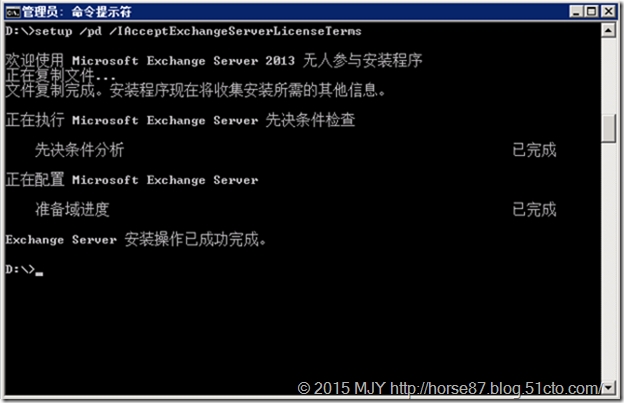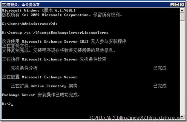 在主域控上放入Exchange Server 2013安装光盘,使用管理员打开CMD,定为到Exchange安装盘,下述命令扩展架构
