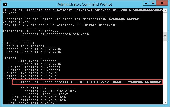 通过ESEUTIL /MH命令可以查看数据库的签名。这时你又需要把数据库卸载以检查状态,但这次老板给你的时间不会太多。