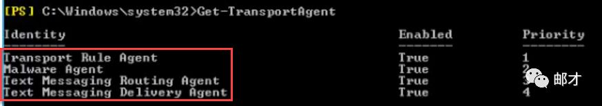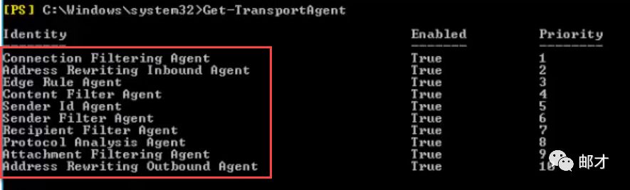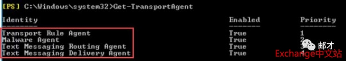 首先我们来看一下在2013/2016的边缘传输服务器都有哪些传输代理(Get-TransportAgent):