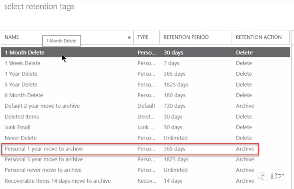 Exchange 2016(包括2013以及Exchange Online)默认已经有13个预定义的标记,从“一周后就删除”到“永远不归档”几乎涵盖了所有法律法规及企业定制化的需求。这里我们选择一年后归档这个标记。