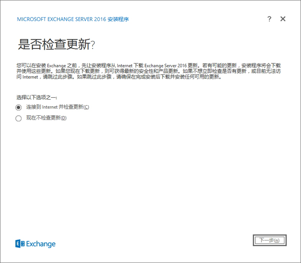 本文Exchange中文站(http://www.exchangecn.com)介绍的环境是在Windows Server 2012环境下进行,请确保已经安装好了域环境。远行Exchange 安装程序后出现以下界面,选择【连接到Internet并检查更新】,如果没有网络的话,可以选择【现在不检查更新】。