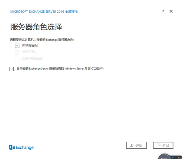 在“服务器角色选择”界面,选择【邮箱角色】,因为Exchange 2016已经将原来 Exchange 2013 的客户端访问角色集成要邮箱角色当中,像 Exchange 2003那样简化,所以这里选择【邮箱角色】,为了便于安装,也把下面的【自动安装Exchange Server 安装所需的Windows Server 角色和功能勾选】: