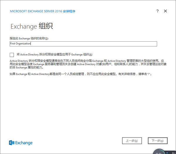 在“Exchange组织”界面输入指定Exchange组织的名称,下面的Active Directory折分选项的目地是为了区别Exchange中的用户是否可以跟AD一同管理的,如果计划Exchange与AD未来由不同的人员来管理的话那么需要勾此选项(在Active Directory拆分权限模式中,不能在域控上安装Exchange服务器),如果在域控上安装Exchange服务器,那么需要取消Active Directory前面的勾,然后选择【下一步】:
