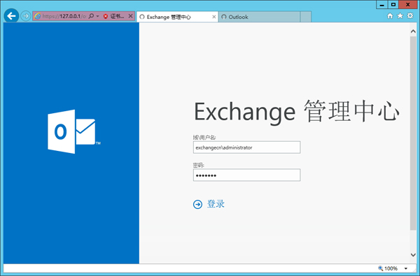 安装完成后,就可以通过在浏览器中输入 https://域名/ecp 对Exchange 2016 进行相应管理了,下面的示例是直接通过访问127.0.0.1进行访问配置的。