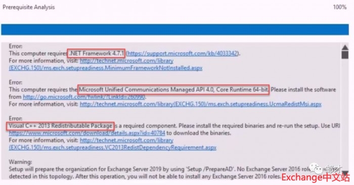 系统组件扩展完成后,还需要安装三个功能性组件,分别是.Net Framework 4.7.1(Exchange 2016为.NetFramework 4.6);UCMA4.0(与Exchange2013,2016相同);Visual C++ 2013再发行版包(新组件)。