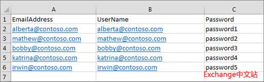 在此步骤中,您将使用 Excel 创建迁移文件,此文件是逗号分隔值 (CSV) 文件,包含要迁移到 Office 365 中的 Gmail 帐户的列表。可以使用 Excel 2013、Excel 2010 或 Excel 2007 创建 CSV 文件。