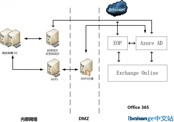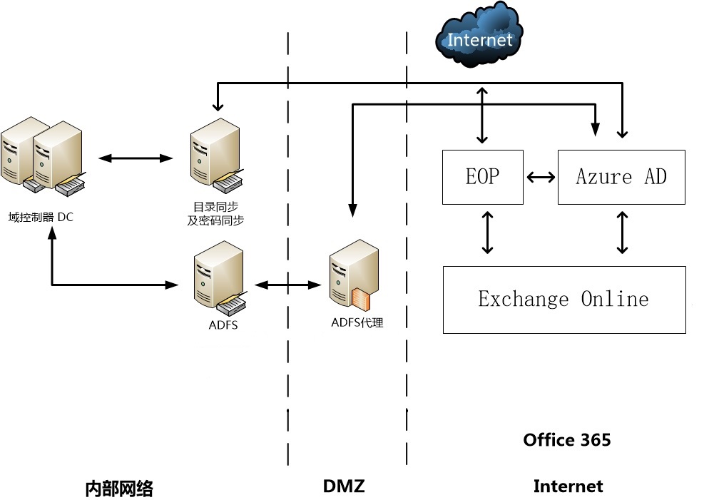 本文章主要介绍Office 365的全新安装部署,包括Office 365设置、配置目录同步、安装ADFS(单一登录服务器及代理),下面介绍一下整体环境及设计架构。
