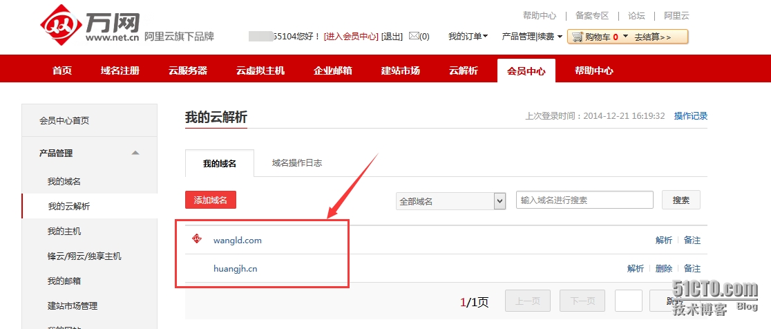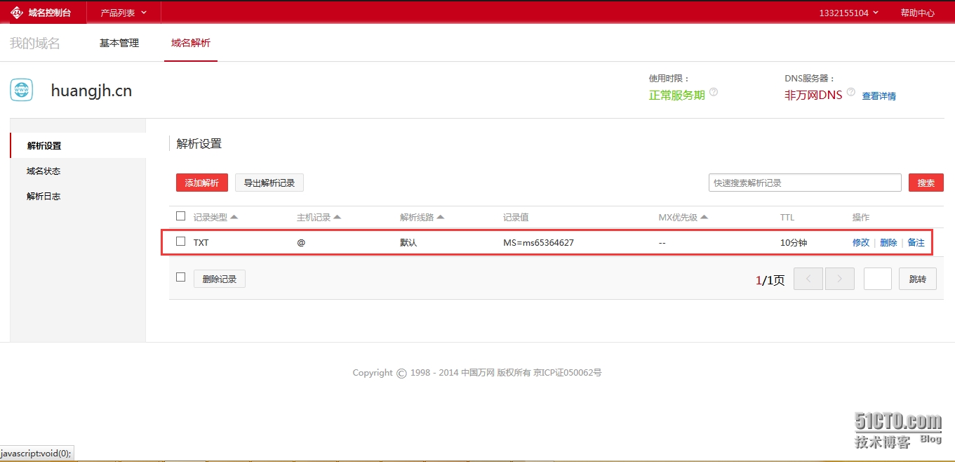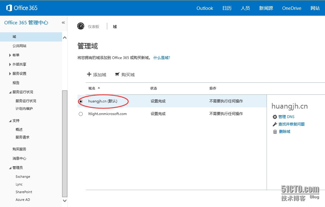 - 此时已经成功添加域huangjh.cn了,域名已经在管理列表中。