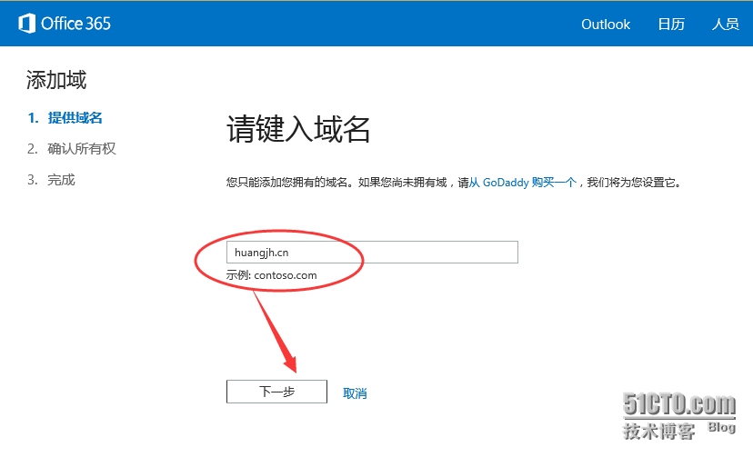 - 输入域名“huangjh.cn”,点击“下一步”