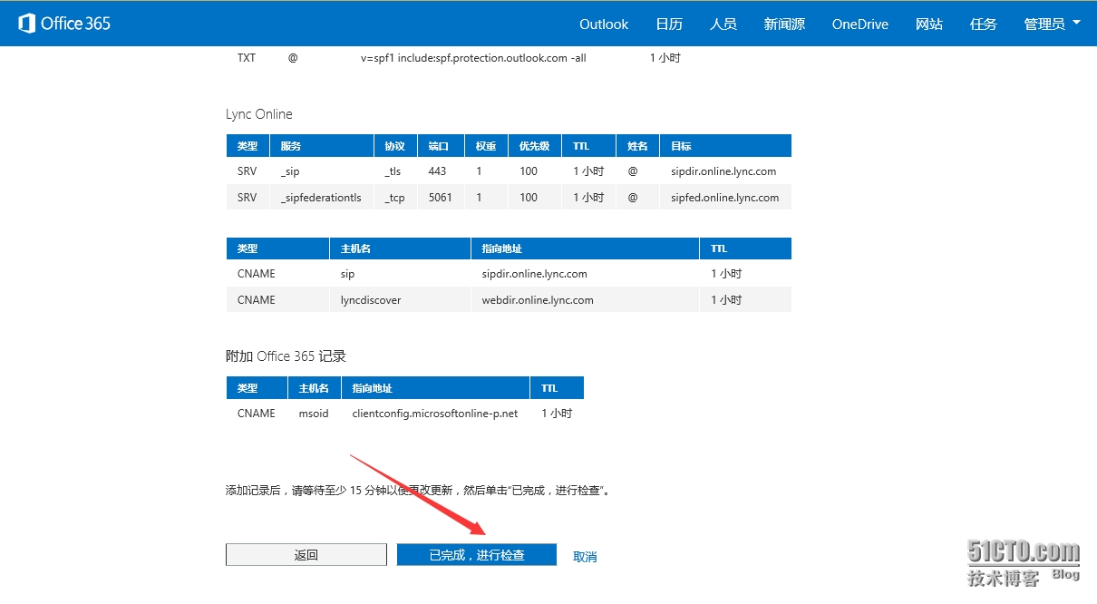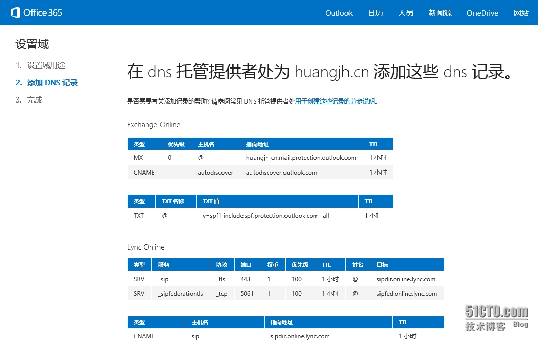 - 列出了需要为ExchangeOnline和Lync Online 添加的DNS记录;