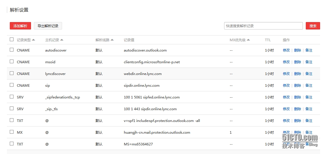 - 必须已经在DNS 主机提供商注册域名,域名提供商是挺多,但个人建议在万网上注册自己或公司的域名,万网域名支持免费添加SRV, TXT等记录,生效时间也比较快。我申请了以下2个域名,本次使用的域名是huangjh.cn