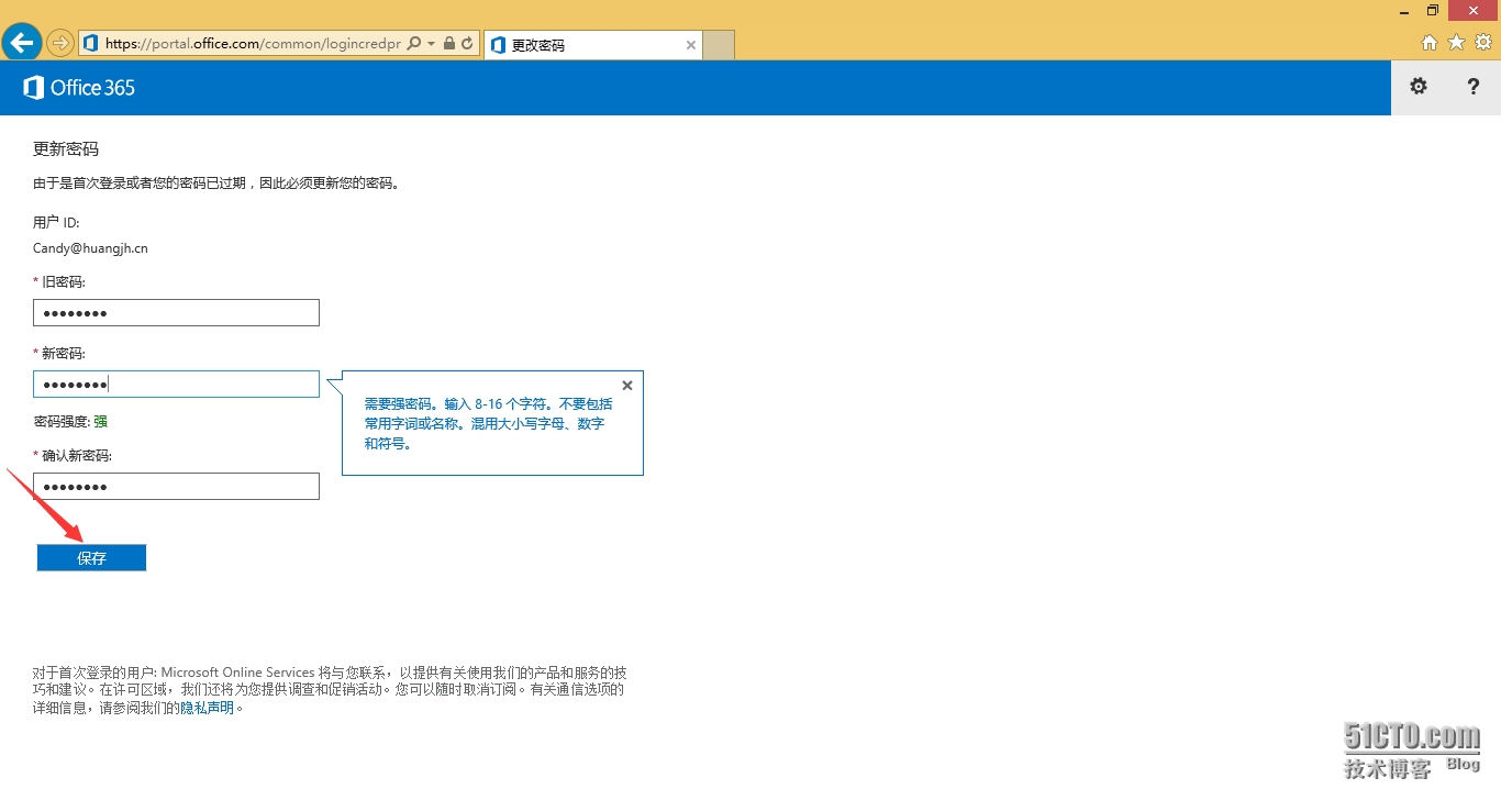 首次登录提示你更改密码,输入密码后点击“保存”(密码必须符合复杂性和长度)