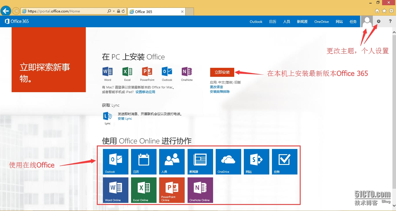 登陆后在此页面中可以处理很多事情,包括在线使用Office、安装Office 365、更改个人设置等。