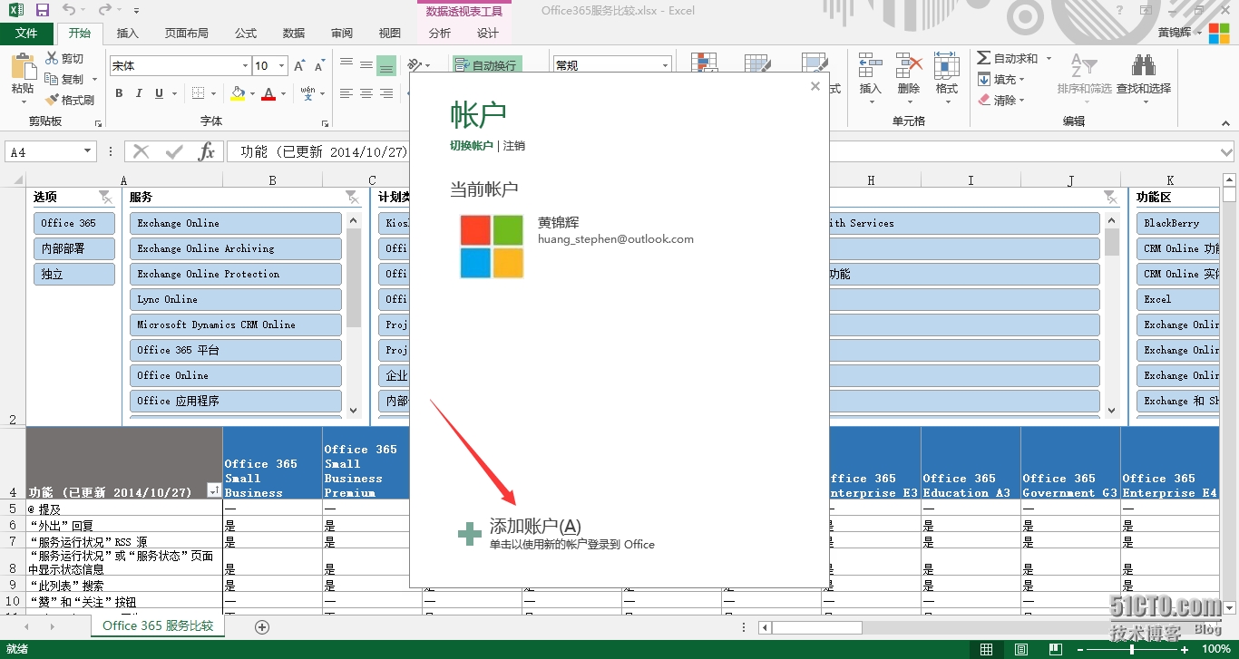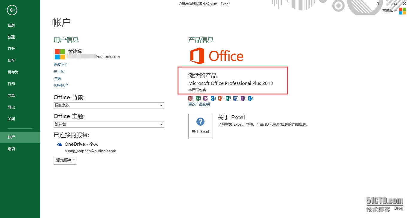 接下来我们先来看看如何通过O365订阅激活本地Office Professional Plus 2013。打开本地Office, 目前我是使用微软Outlook账户登录。