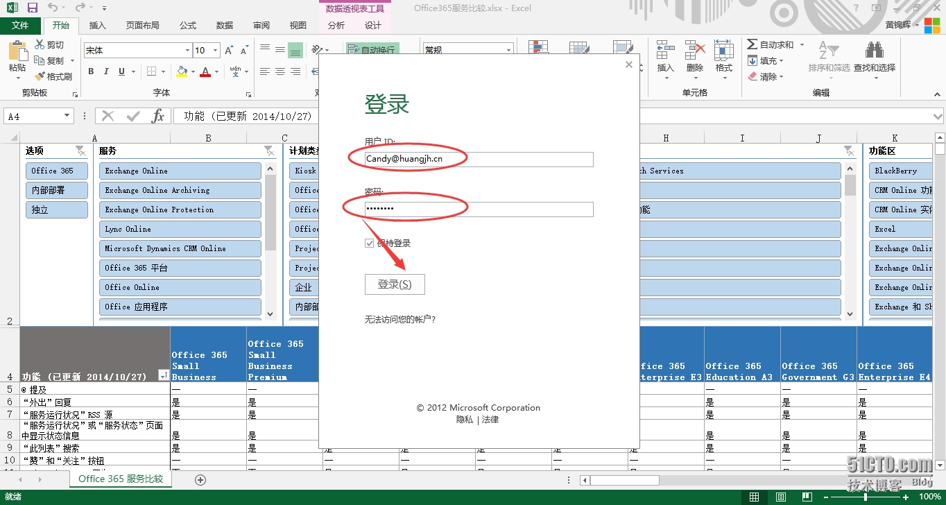访问全球版O365登陆页面,输入账号密码(此处使用账号Candy@huangjh.cn和随机密码进行登陆)
