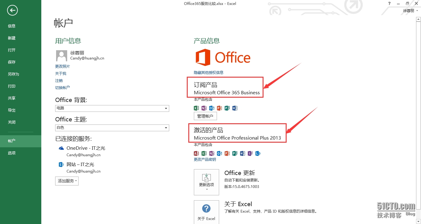 再次回到Office, 可看到多了一个Microsoft Office 365 Business的订阅产品了,这可以说明已经是通过成功安装O365了