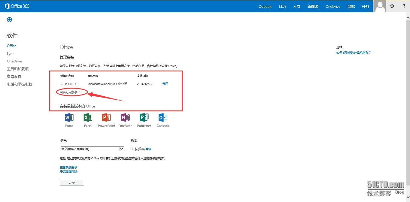 看到已经通过该账户安装并激活的计算机名、操作系统和安装日期。而且剩余可用安装数量为4个。如果以后有第六台计算机需要安装激活可以通过点击“停用”按钮将不会的停掉即可