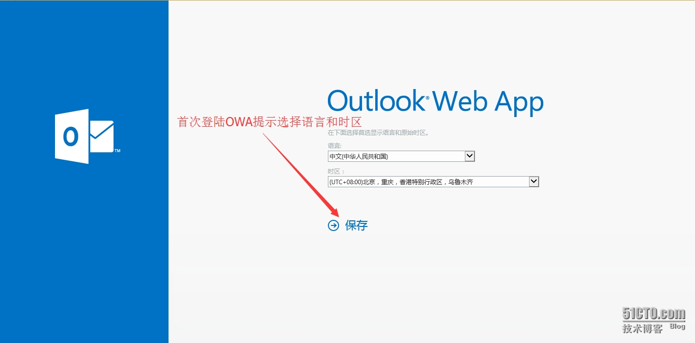 - 首次登陆OWA根据提示选择语言和时区,点击“保存”