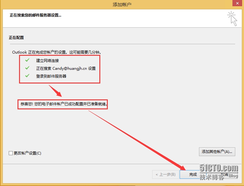 - Outlook会通过Exchange 的自动发现技术联系到Exchange 邮件服务器。稍等片刻后即成功配置,点击“完成”