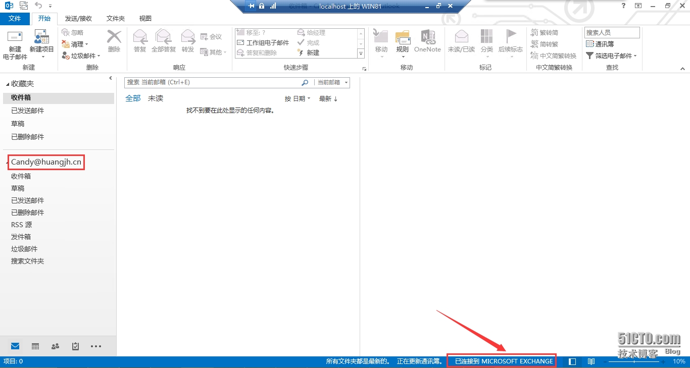 - 打开Outlook后确保已显示“已连接MICROSOFT EXCHANGE”,此时就可以通过正常收发邮件、访问日历等等功能了。