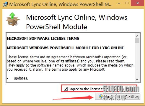 - 运行LyncOnlinePowerShell 模块程序,勾选”I agree to the license terms and conditions“,点击”Install“