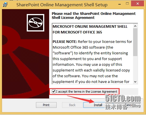 - 运行SharePointOnlineManagementShell 模块安装程序,勾选”I accept the terms in the license Agreement“,点击”Install“