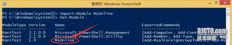 - 运行命令” Import-Module MsOnline” 导入O365模块, 在运行” Get-Module”, 可看到已经导入多一个模块了;