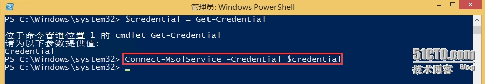 - 通过命令” Connect-MsolService -Credential $credential” 连接到O365, 确保没有任何报错和警告