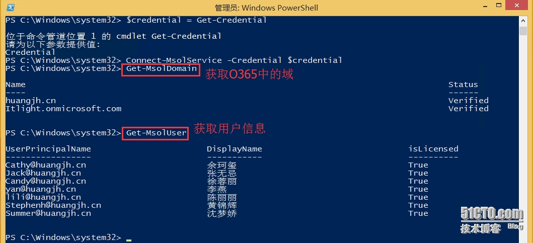 - 此时就可以管理O365了,可以运行一下几个命令进行测试,如下: