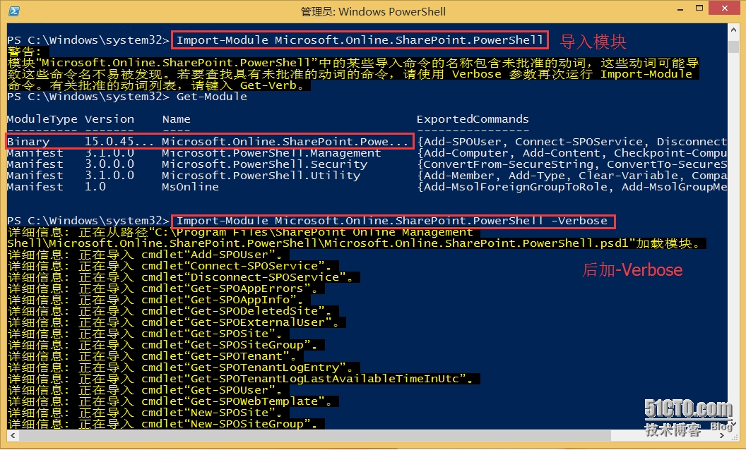 - 运行命令” Import-Module Microsoft.Online.SharePoint.PowerShell” 导入模块,会收到警告提示有些命令可以没有导入,可以通过后加-Verbose再次导入